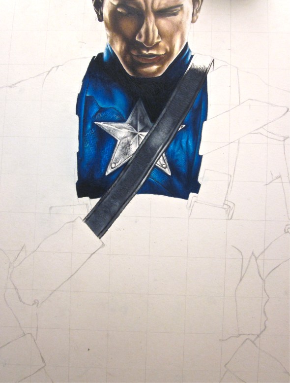 Testing the distinctive Prismacolor shading in a separate poster board is always a procedure that I try when working on the full color mode. Captain America displays blue as he represents the colors of the American flag. The unique tones of blue blend perfectly well together to exhibit the continuous light and shade.