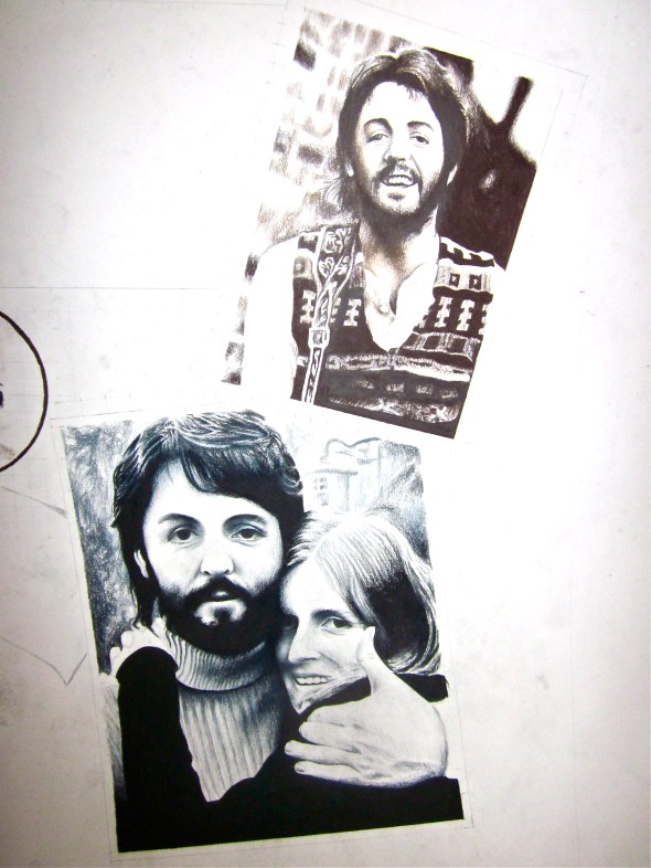 This is a colored pencil drawing of two images from McCartney 1 and one image of McCartney 2. One of them is done in black and white style and the other two are done in Sepia tone. It measures 24 by 30 and completed on a poster board. I came up with the idea of making them look like three distinctive photographs in 3-D style overlapping each other with a post card that reads “McCartney”. I thought it would be a nice touch to draw an Apple logo stamp with London postage seal as well as two separate seals on the yellow background. That gives it a glimpse that they are placed in front of a large envelope. I hope you like it.