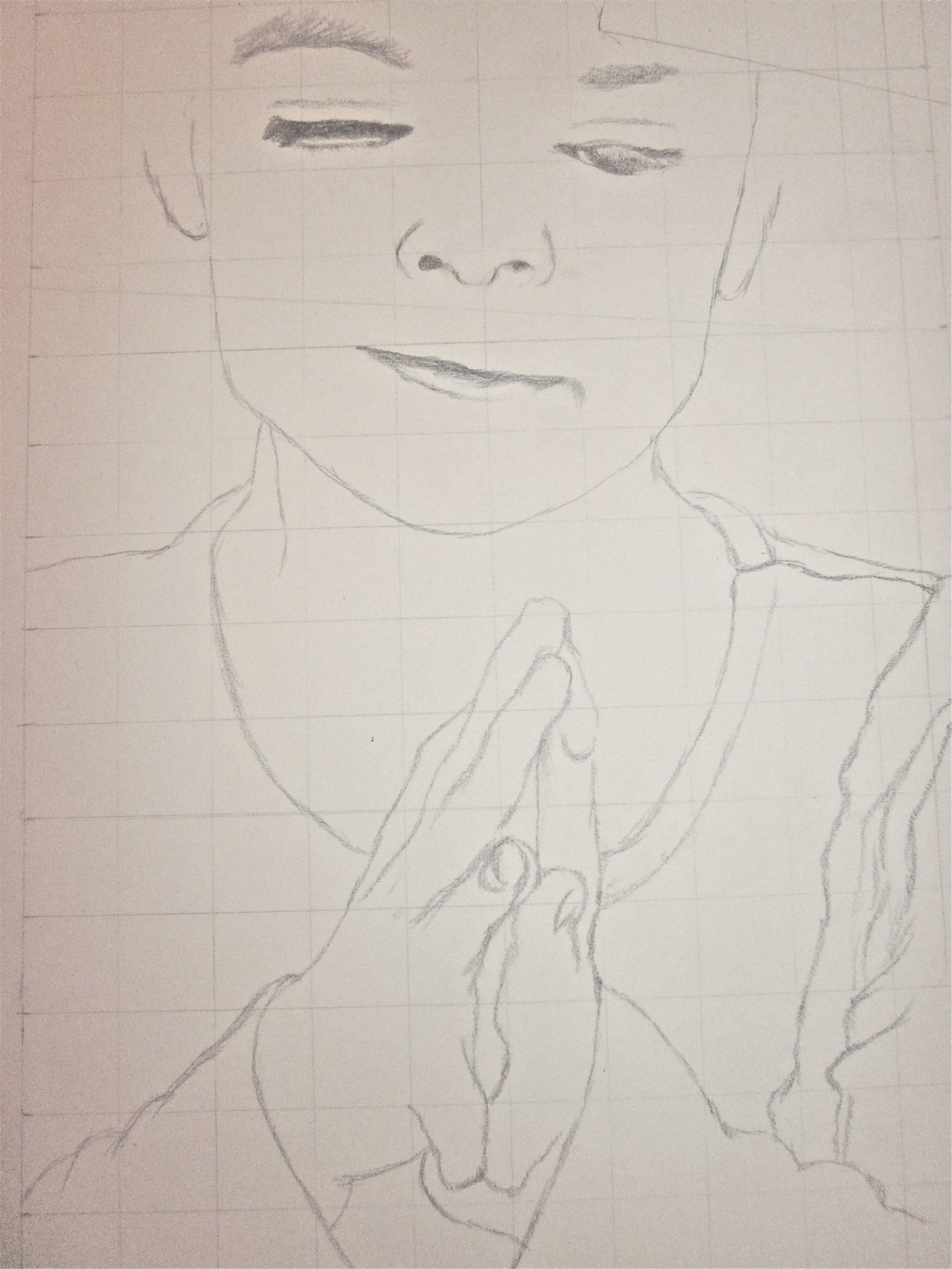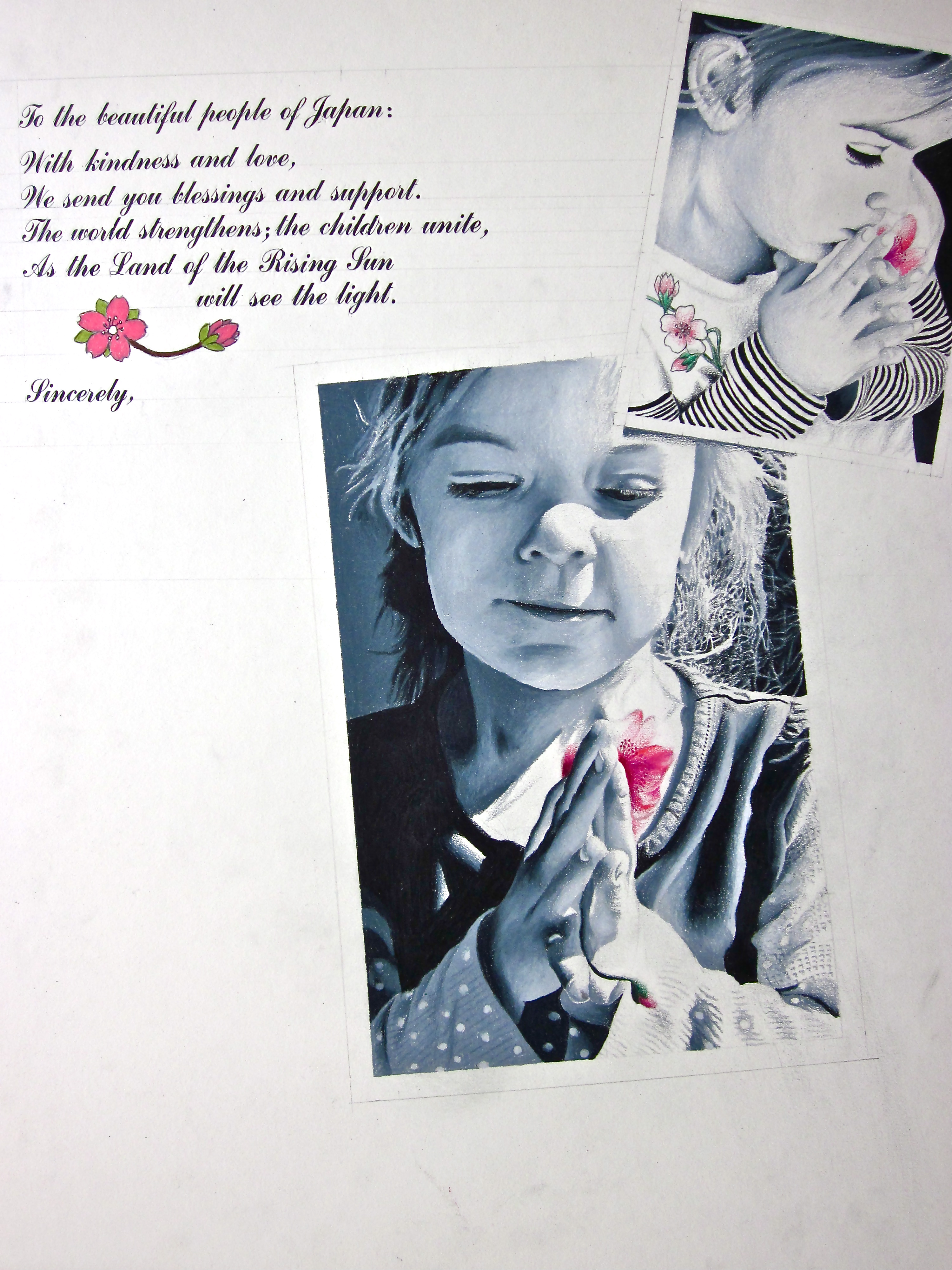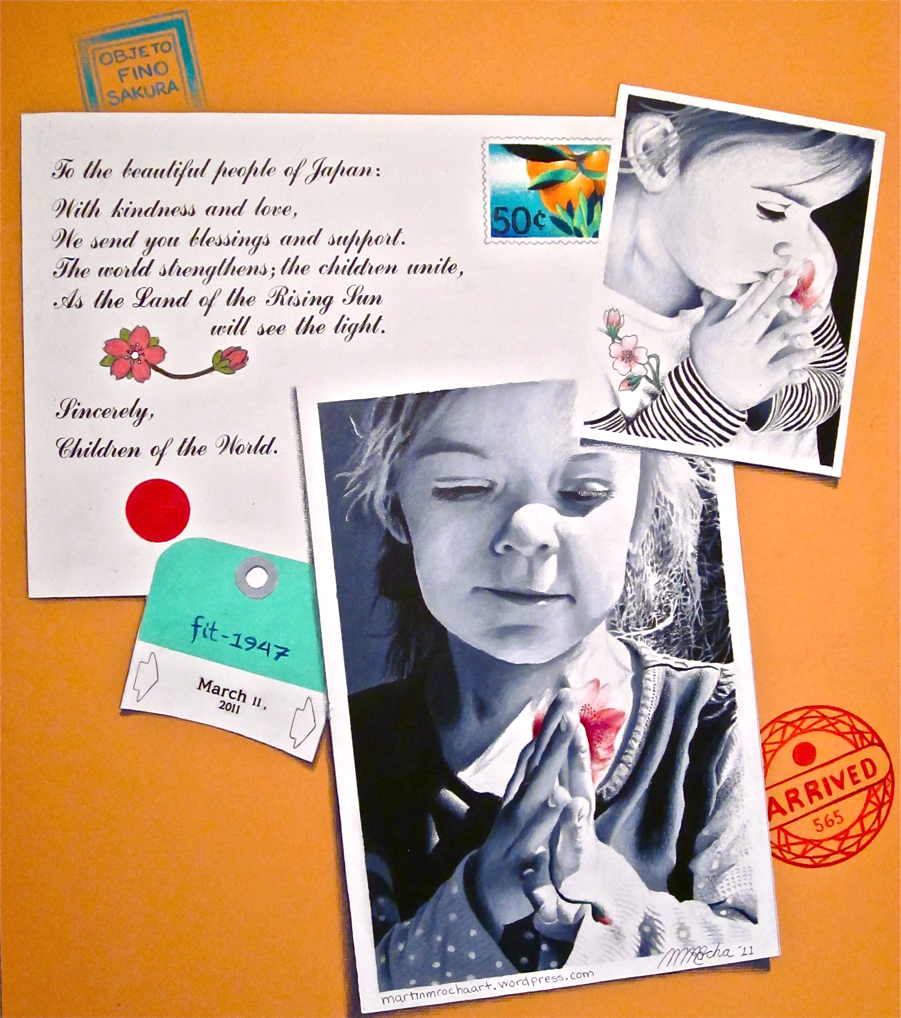 What do you think art fans? The appearance of two black and white photographs and a postcard overlapping displays a 3D appearance; a view of prayer and hope as it unfolds. As a final step, the background poster board illustrates an envelope with two postage seals to enhance its significance. It is not everyday that we encounter such powerful, meaningful messages that touch our everyday lives.